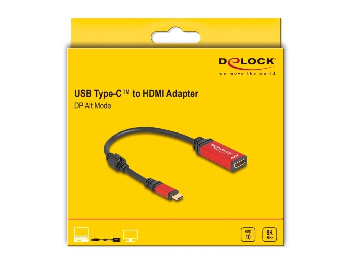 Tento adaptér značky Delock je vhodný pro připojení monitoru HDMI v rozlišení 8K Ultra HD (7680 x 4320 @ 60 Hz) k počítači s rozhraním USB-C™ a s podporou alternativního režimu DisplayPort. Díky tomu může být adaptér připojen k různým notebookům jako je MacBook, Chromebook a podobné. Kromě toho, může adaptér pracovat na rozhraní Thunderbolt™ 3.
