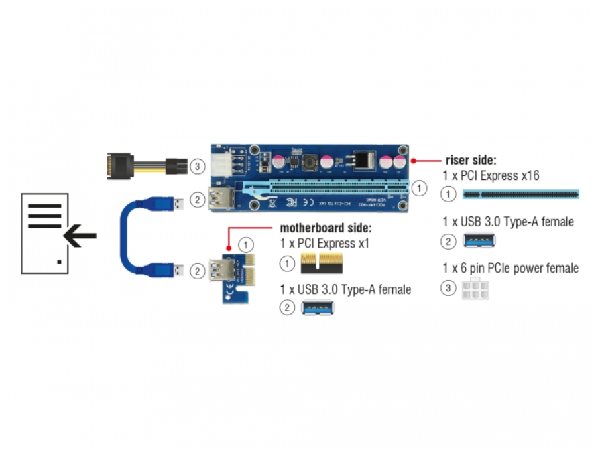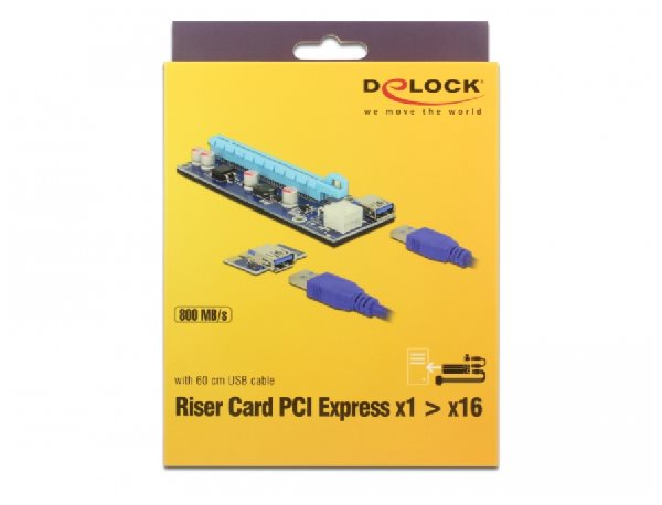 PCI Express riser card od Delocku může být připojena do jakéhokoliv slotu PCI Express x1 na základní desce. Poté může být slot x16 PCI Express umístěn v jiné pozici. To umožňuje pracovat grafické kartě v každém slotu PCIe na základní desce, I když je grafická karta širší než jeden slot. Pomocí několika riser karet může být několik grafických karet provozována současně na jedné základní desce, např. pro sledování krypto měn jako jsou Bitcoin, Ethereum nebo Zcash.
