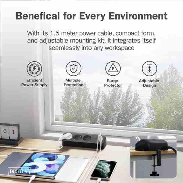 Vylepšete si pracovní prostor s tímto praktickým stolním prodlužovacím kabelem. Součástí dodávky je stolní svorka, která vám umožní umístit prodlužovací kabel kamkoli potřebujete. 1,5m napájecí kabel a kompaktní design usnadňují integraci do většiny sestav. Tři uzemněné zásuvky napájejí vaše zařízení přímo u stolu. Konstrukce s úhlem 45° umožňuje připojení větších zástrček, aniž by blokovala jiné zásuvky. Tři nabíjecí porty USB umožňují pohodlné nabíjení mobilních zařízení, ať už jde o chytré telefony nebo tablety. Integrovaná krytka a vylepšená ochrana proti kontaktu uzemněných zásuvek zajišťují vaši bezpečnost i bezpečnost ostatních a umožňují vám pracovat s klidem.