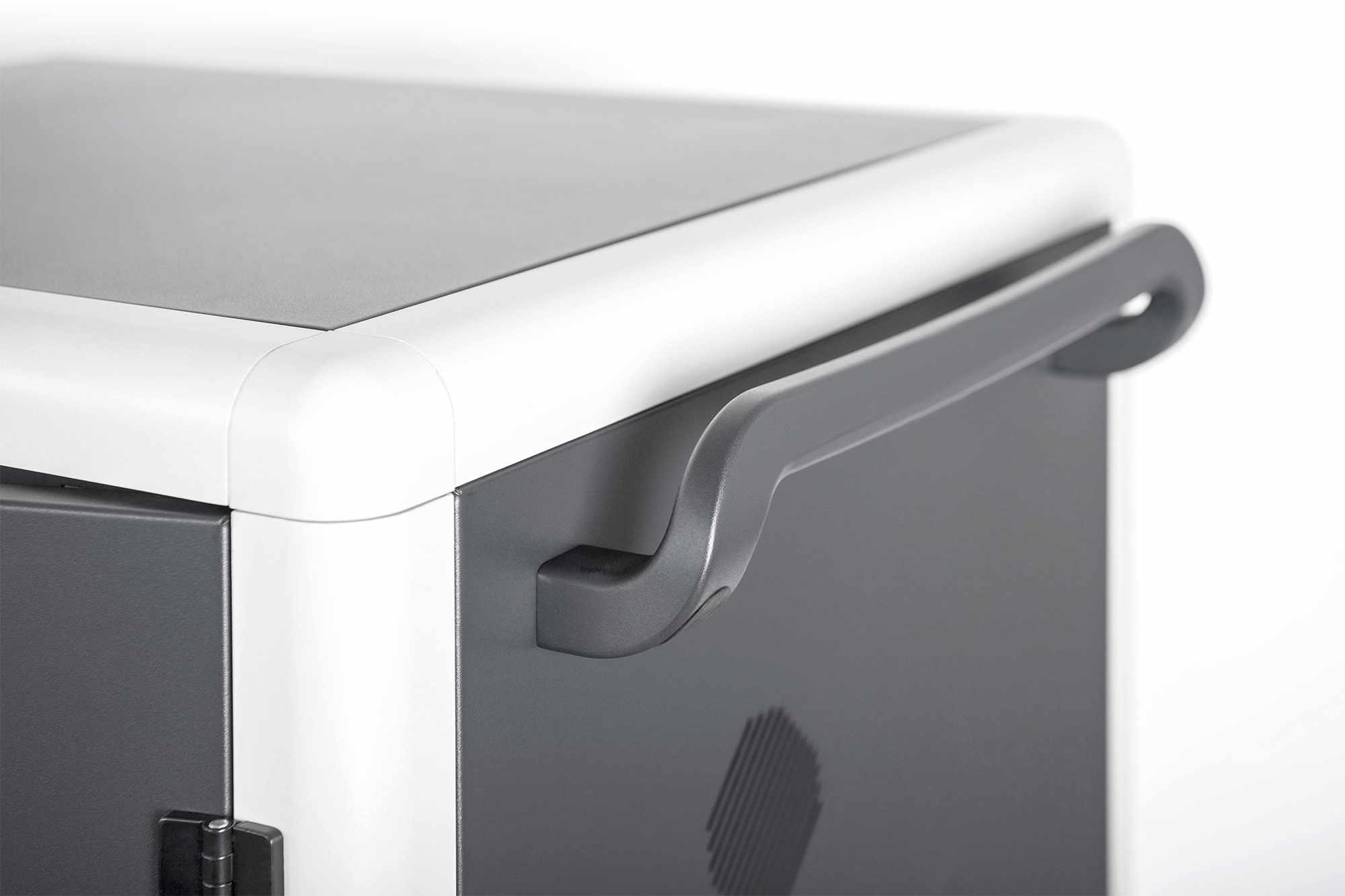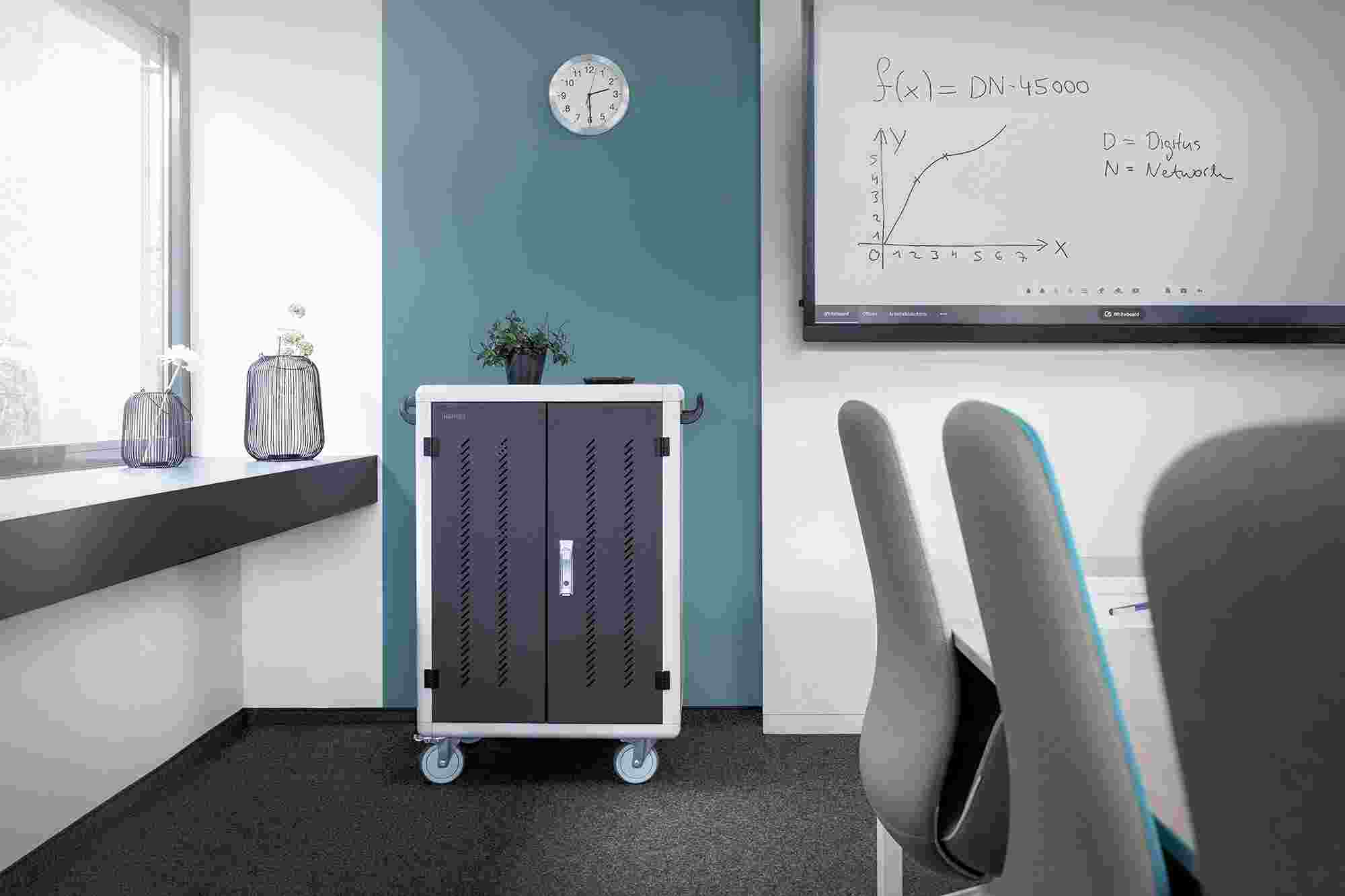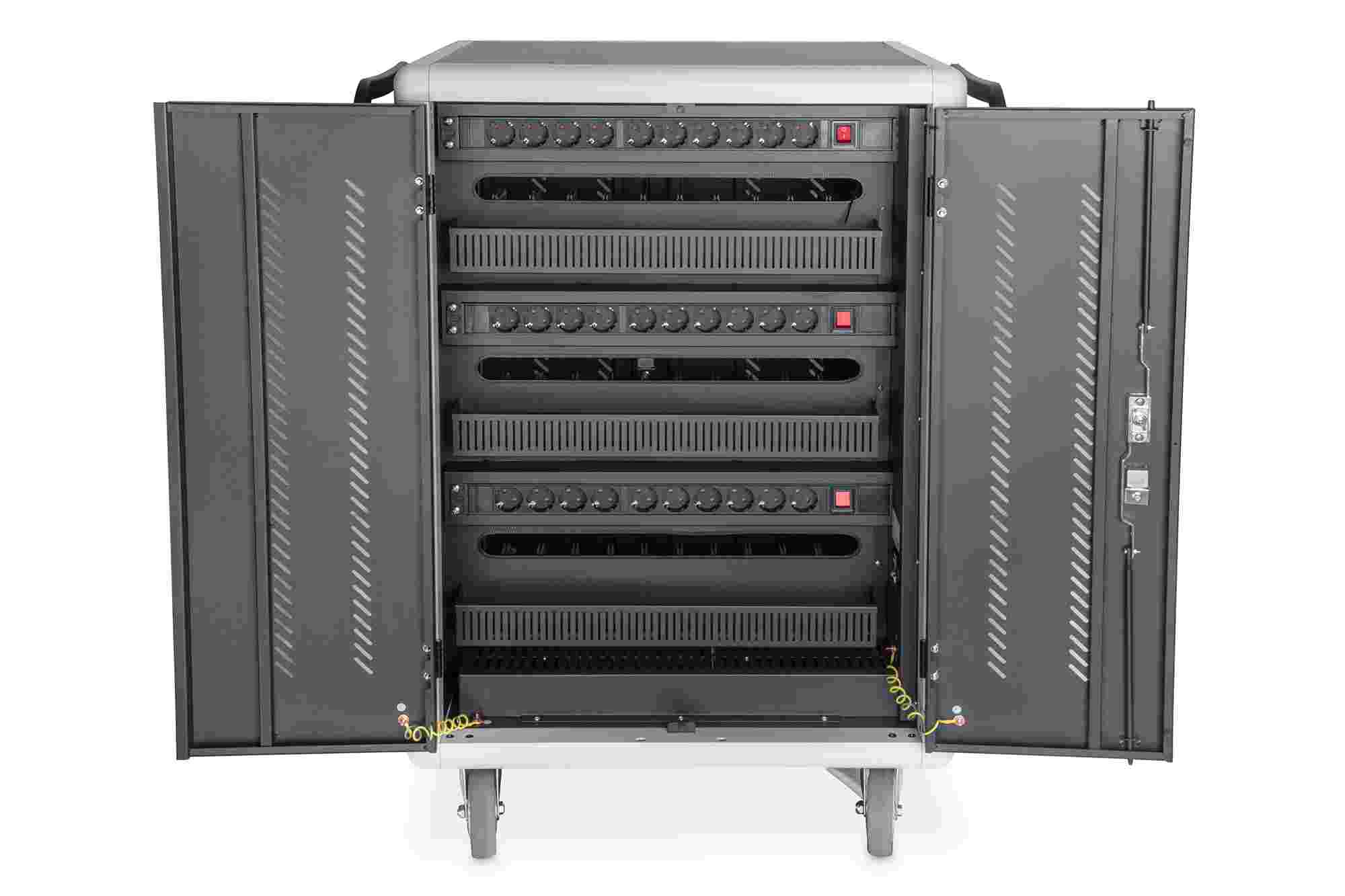 Mobilní nabíjecí skříň od společnosti DIGITUS® je ideálním a kompaktním řešením pro ukládání a nabíjení přenosných zařízení, jako jsou notebooky a tablety. Mobilní nabíjecí skříňky se často používají ve veřejných zařízeních, jako jsou školy, aby bylo možné zařízení bezpečně uložit na centrálním místě a zároveň je nabíjet. Skříňka obsahuje 3 řady po 10 nabíjecích stanicích, které mají na přední straně vlastní připojení USB. Zařízení lze připojit také pomocí instalovaných zásuvkových lišt (3 x 10 bezpečnostních zásuvek) v zadní části. Díky dostatečnému množství kabelových průchodek a úložnému prostoru pro přebytečné kabely je zaručena optimální správa kabelů. Instalované ventilátory (3 x 24 V) v kombinaci s větracími štěrbinami zajišťují aktivní chlazení skříně. Instalované UV-C lampy zajišťují sterilní podmínky, a tím i šetrnost k životnímu prostředí a zvýšenou hygienu.