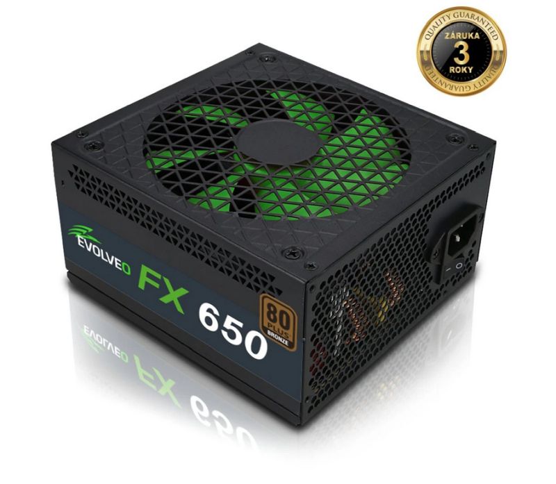 EVOLVEO FX 650, zdroj 650W, 80+ Bronze, ATX 2.2, 2× PCIe, aPFC, tichý 140mm ventilátor, 6x SATA, bulk, záruka 3 roky, černý