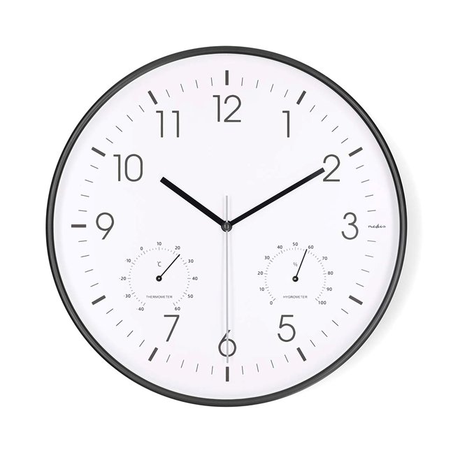 Nedis CLWA4226BK - Nástěnné hodiny | Průměr: 300 mm | Plast | Tichý pohyb | Teploměr | Vlhkoměr | Bílá / Černá