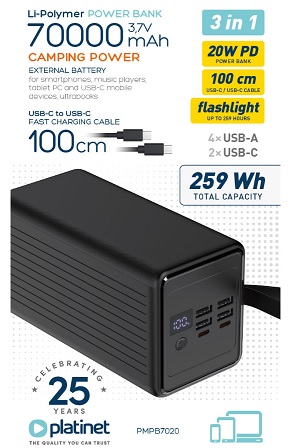 "PMPB7020 je vysokokapacitní power banka, která nabízí rychlé a efektivní napájení elektronických zařízení. S obrovskou kapacitou 70 000 mAh při 3,7 V (ekvivalent 51 800 mAh při 5 V) můžete své smartphony, tablety a další mobilní zařízení dobít několikanásobně, než budete muset powerbanku znovu připravit k použití.