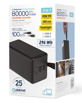 "PMPB8020 je vysokokapacitní power banka, která nabízí rychlé a efektivní napájení elektronických zařízení. S ohromnou kapacitou 80 000 mAh při 3,7 V (ekvivalent 59 200 mAh při 5 V) můžete své smartphony, tablety a další mobilní zařízení dobít několikanásobně, než budete muset powerbanku znovu připravit k použití.