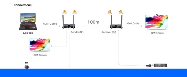 - Vysílač má lokální HDMI výstupní konektor pro lokální HDMI monitor