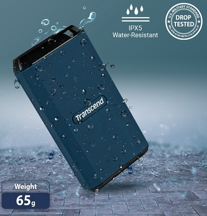 Transcend's matchbox-sized ESD410C features an incredibly rugged and water-resistant construction. An integrated lanyard hole allows for a wide range of attachment options. ESD410C's IPX5* rating and MIL-STD-810G US military drop-test compliance means that you can rest assured that your data is fully protected against the elements, even enduring a 3-meter drop!**